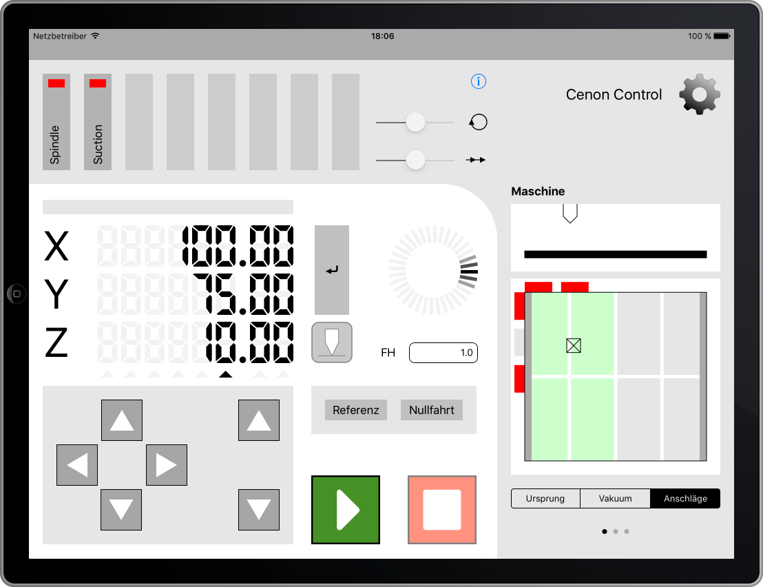 Die Cenon Control App ist ein Panel zur Maschinen-Steuerung für die Fertigungs-Software Cenon CAM (auf Mac). Cenon Control verbindet sich über das lokale WiFi Netzwerk mit Cenon. Sobald verbunden, kann Cenon Control die Maschine und die Ausgabe vom iPad aus steuern, also immer von der optimalen Position an der Maschine, mit dem perfekten Blick auf das Werkstück.