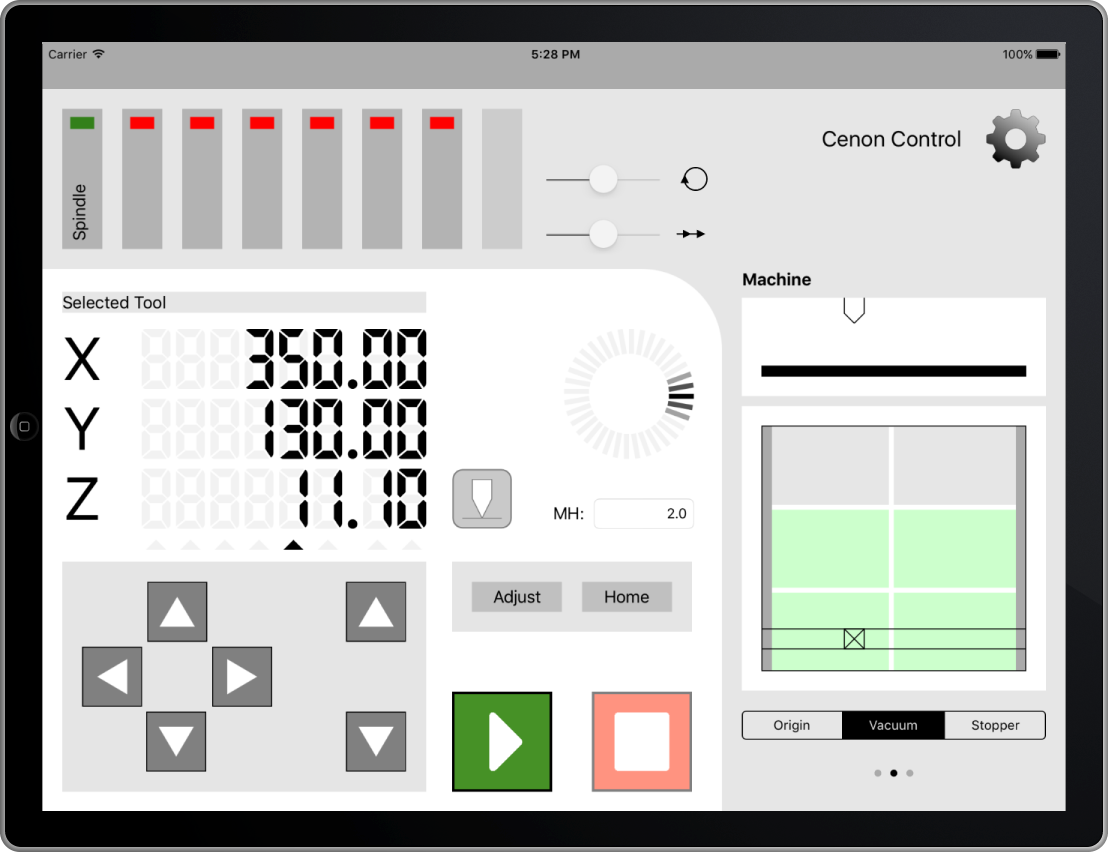 The Cenon Control app is a machine control-panel for the manufacturing software Cenon CAM (running on Mac). Cenon Control connects to Cenon via your local WiFi network. Once connected, you can control your machine and output via the iPad, right from the best position around your machine, and with a perfect view of your work piece.