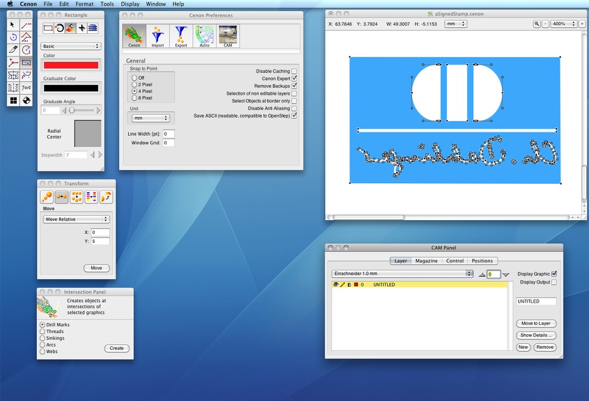 Beside editing graphics, Cenon empowers you to work on graphic objects by applying transformations like moving, rotating, arranging, as well as by applying complex manipulations like uniting, joining and punching.
