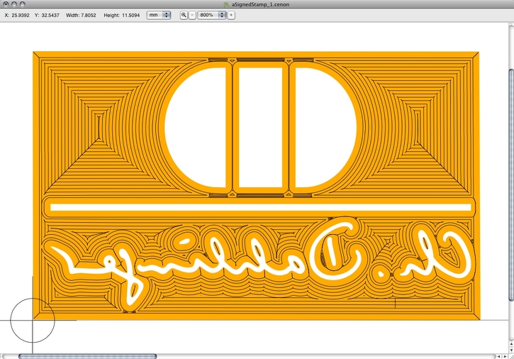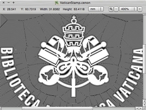 | | Engraving with Pick-Out (Carving) For very fine engravings, Cenon offers the "Pick-Out". The Pick-Out can be applied for all kinds of stamps and embossing tools, as well as for engraving coins. The Pick-Out enables you to create very delicate engravings of your graphic-design by adjusting the immersion depth of the engraving tool, lifting the tool while moving into tight corners, for example serifs of letters. It's a must have for every fine engraving. |