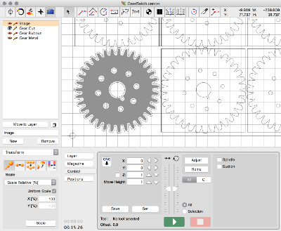 However, despite hundreds of new features and details, we always take huge efforts to stay with accustomed defaults, ease-of-use, and keep everything in working order. The new Composite Window combines the Document + Editing Tools + Inspector + CAM-Panel + Panels in a single window. Here you find everything you need in one place, well arranged around your document. Not all machines provide an unobstructed view of the tool. With the Camera-Positioning you can position the machine with the help of a camera mounted to the machine. The CAM-Panel of Cenon now includes a Machine-View (fold-out), which allows you to move the machine directly to the position of your mouse-click. Carving of raised objects (V-Carve) To achieve a nice 3D appearance, Cenon now supports carving of raised paths. You can apply this feature to create text or signs with an improved 3D-look. In the past, the Pick-Out feature was only available for engraving - now this carving-feature can be generally applied, for example in sign-making. The new Cenon Control App for iPad has a dedicated news page, where you can find everything about our new IOS App. Starting with Cenon version 5.0 you can control your machine via an iPad from any location around your machine. Everyone knows these buttons from Audio- and Video-devices. Now, the output to machine is even more intuitive by applying these well known symbols. The new user-experience also eliminates the need for an alert box, when pausing the output. Fast Bridges (Webs) We optimized the underlying algorithms and were able to increase the output speed of bridges (webs) considerably. Multi-Head Option To comfortably support multiple tool heads (for example a spindle plus a tangential knife), Cenon now supports multiple tool offsets and other requirements. Tool-Parameters for Layers With Cenon, tools from a magazine are assigned to a layer, and the tool parameters are all managed in the Tool-Magazine. This is straight-forward and an essential part of the ease-of-use. Separate Smoothing-Layer So far, smoothing in Cenon can be managed for each layer, leaving a few situations, where this lacks flexibility. The new NC-Data (G-Code) Import builds up on the existing import of drill data. One application of the NC-Data import is to review NC-data exported from Cenon. The import currently doesn't allow to use Cenon as CNC-Terminal to actually output NC-Data (as is) to the machine. Completely revised User Interface We overhauled all panels, improved the arrangement of control elements; we added pre-defined document sizes to the working area panel (A4, A3, letter, ..., Custom), a default can be stored. New menu items like "Open Recent"; "Order Back" of windows, ...; Passive Layers are easier to identify. The order to process (output) layers can be reversed, ... What's new in Version 5.0 ?